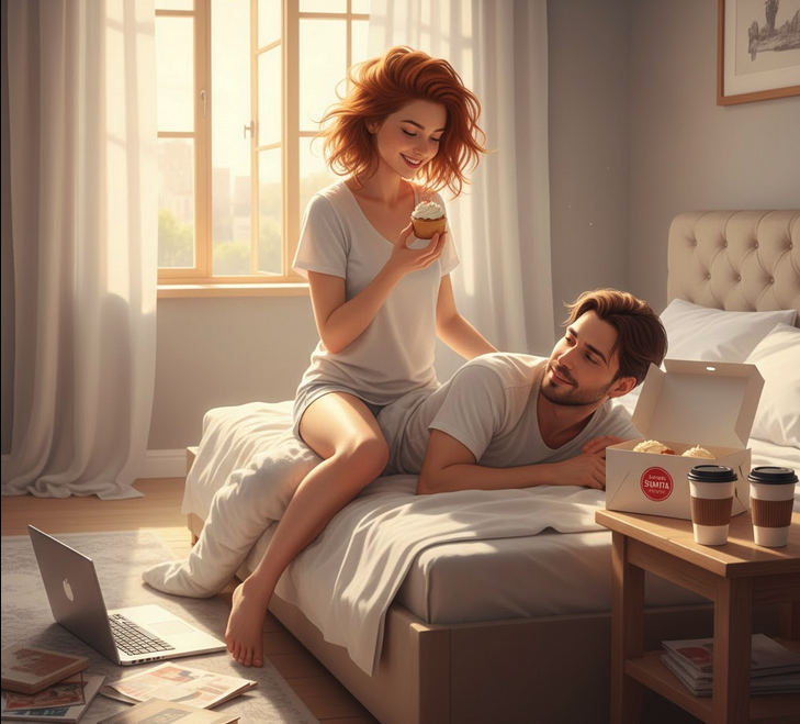 Liam was still asleep when Eva placed two paper cups of hot coffee and a white box with the red “Elite Taste” logo on the nightstand.